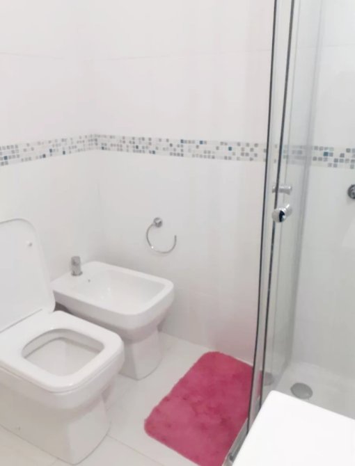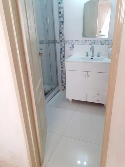 Baño principal, con guardas intermedias armadas con venecitas de mármol y vidrio, vanitory amplio con mesada de cerámica.