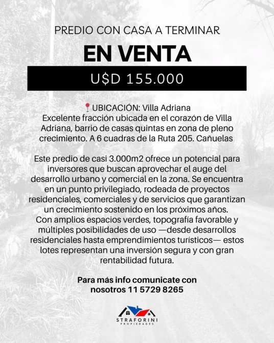 Excelente fracción ubicada en el corazón de Villa Adriana, barrio de casas quintas en zona de pleno crecimiento. A 3 cuadras de la Ruta 205. Cañuelas